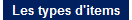 On peut distinguer deux grandes catégories d'items : ceux dont la correction est objective et ceux dont la correction est plutôt subjective. Chacune de ces catégories comporte plusieurs types d'items. Nous fournissons plus loin des caractéristiques des types d'items énumérés.